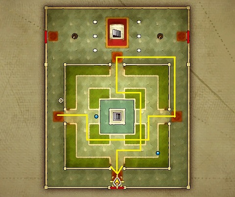 西の像の前から十字を描くように進むと、橋が出現して階段が使えるようになりました。マーディラス城の水の塔2階の仕掛けと同じ解き方ですね。