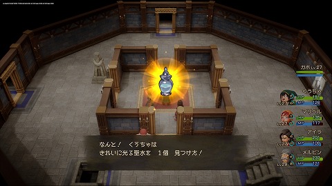 宝箱には、きれいに光る聖水が入っています。宝箱が開けられなくて困っている男性に渡すことになります。