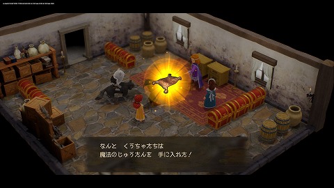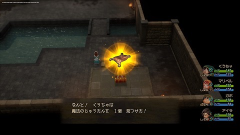 地下倉庫の南の宝箱を調べると、魔法のじゅうたんが入手できました。▲ボタンを押すと、フィールドで魔法のじゅうたんに乗れます。空中に浮いているので、川を越えることが可能です。