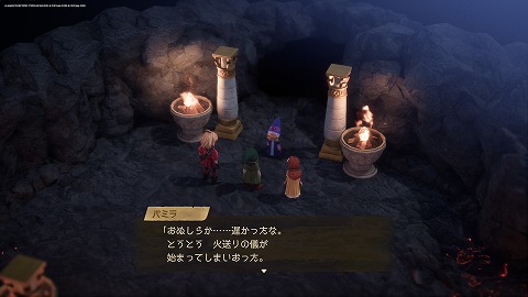 炎の山・頂上にいるパミラに報告すると、炎の山クリアです。エンゴウの村(過去)に自動で移動しました。
